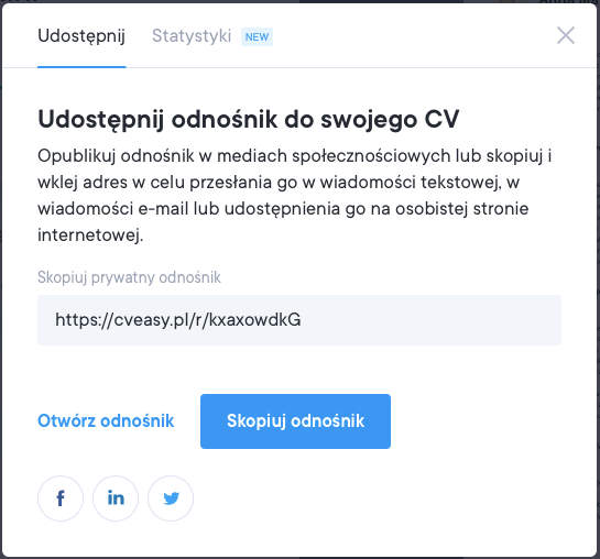 Każda wersja Twojego CV ma swój wyjątkowy link, który możesz udostępnić innym. Jeśli posiadasz wiele wersji swojego życiorysu, masz do dyspozycji szereg rożnych linków, które możesz udostępniać.