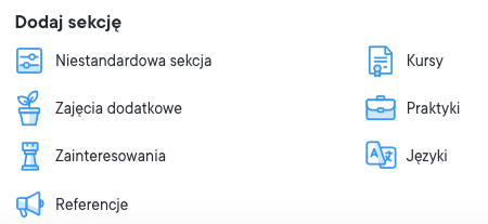 Kolejnym doskonałym sposobem na dostosowanie CV do własnych potrzeb jest dodanie niestandardowych sekcji. Jeśli dodasz taką sekcję, możesz nazwać ją w dowolny sposób. Aby dodać sekcję niestandardową, przewiń edytor CV aż do końca, gdzie znajdziesz różne opcje dodawania nowych sekcji.