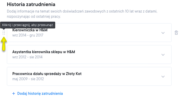 Zmiana kolejności sekcji* – Kolejność wszystkich sekcji znajdujących się poniżej podsumowania w głównej kolumnie życiorysu może zostać zmieniona. W celu zmiany kolejności sekcji, najedź kursorem myszy na tytuł sekcji – wyświetli się strzałka, za pomocą której możesz przesunąć poszczególne sekcje w górę lub w dół. Szczegóły znajdują się na zrzutach ekranu poniżej.