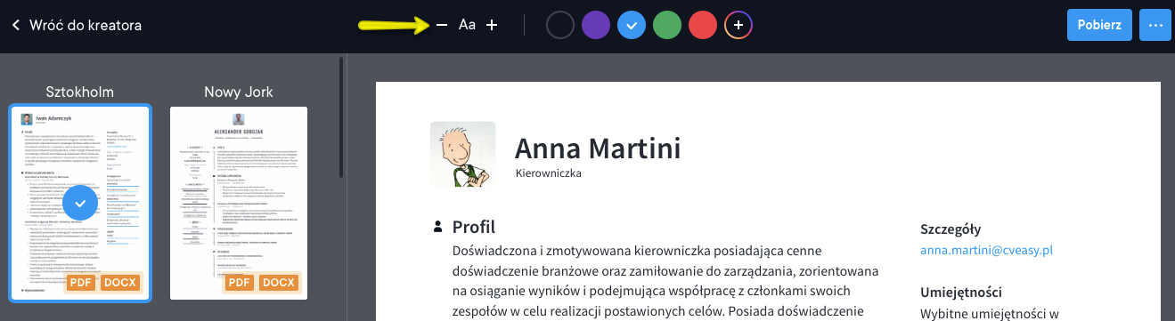 Obecnie użytkownicy nie mogą zmieniać kroju pisma ani rozmiarów czcionek w CV ani w listach motywacyjnych. Mamy nadzieję, że w przyszłości będziemy mogli dodać więcej opcji umożliwiających dostosowanie czcionek do potrzeb użytkowników. W międzyczasie zachęcamy do eksperymentowania z różnymi dostępnymi szablonami, które wykorzystują nieco inne czcionki.