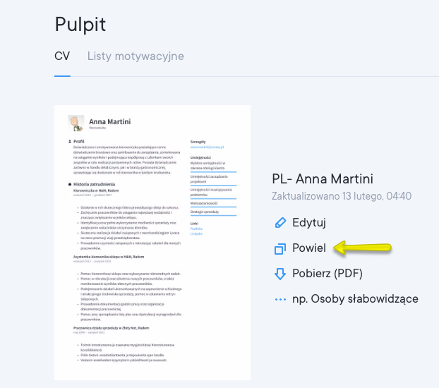 Zaloguj się do serwisu Cveasy.pl i przejdź do pulpitu, na którym znajdują się wszystkie Twoje CV. Zobaczysz tam listę swoich życiorysów. Kliknij przycisk „Powiel”. Szczegóły znajdują się na poniższym zrzucie ekranu.