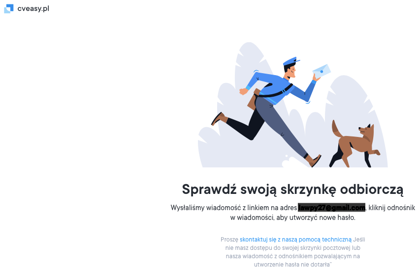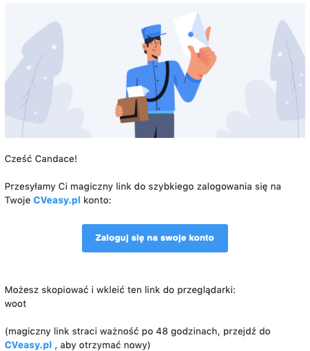 Jeśli Twój adres e-mail działa, lecz nie otrzymujesz wiadomości z magicznym linkiem, sprawdź folder spamu lub przeszukaj swoją skrzynkę odbiorczą w celu znalezienia wiadomości od „Cveasy.pl”.