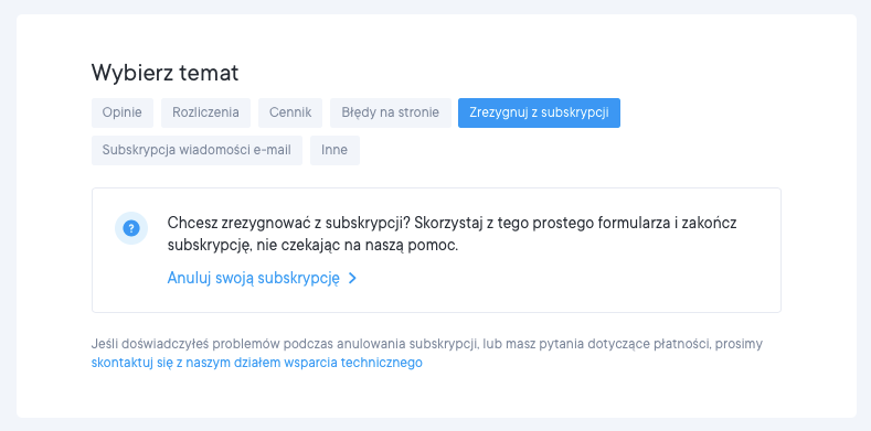 Jeśli Twój adres e-mail nie zostanie odnaleziony, możesz wyszukać inny adres e-mail, który mógł być użyty do rejestracji w serwisie. Jeśli nadal nie możesz anulować swojego abonamentu lub nie otrzymujesz wiadomości e-mail z potwierdzeniem, możesz spróbować wykonać poniższe kroki w celu anulowania swojego abonamentu z poziomu aplikacji lub skontaktować się z naszym zespołem w celu uzyskania pomocy.